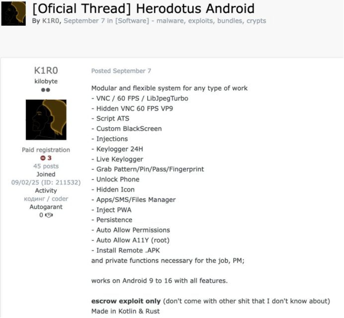 安全机构发现一款名为Herodotus的Android恶意软件,通过模仿人类交互行为绕过安全检测。该软件以恶意软件即服务形式传播,主要针对意大利和巴西用户,通过钓鱼短信诱导安装。其独特之处在于利用了随机延迟注入技术(输入间隔0.3-3秒)模拟真人打字节奏,有效规避了基于行为分析的防护系统。
