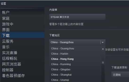 b.切换至 “下载” 选项卡,在 “下载区域” 下拉菜单中,选择 “中国”“新加坡” 等低负载节点;