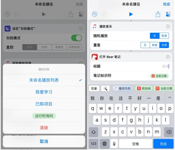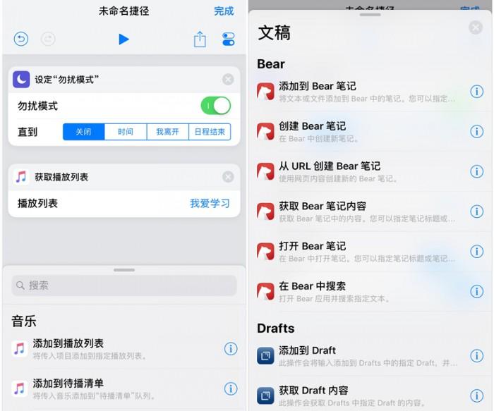 让我们试着做一个简单的捷径:假设我要开始学习,那么iPhone进入勿扰模式,打开「奇妙清单」查看任务,查看完任务后开启本地音乐库中的「我爱学习」歌单,开始播放作业用 BGM,最后在「Bear 笔记」中创建新笔记。