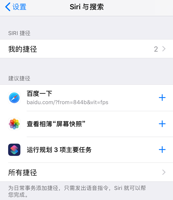 在「设置」-「Siri 与搜索」中可以添加现成的捷径,可以查看已经添加到 Siri 的捷径,对这些 Siri 捷径进行指令重置,或者删除不想要的捷径。