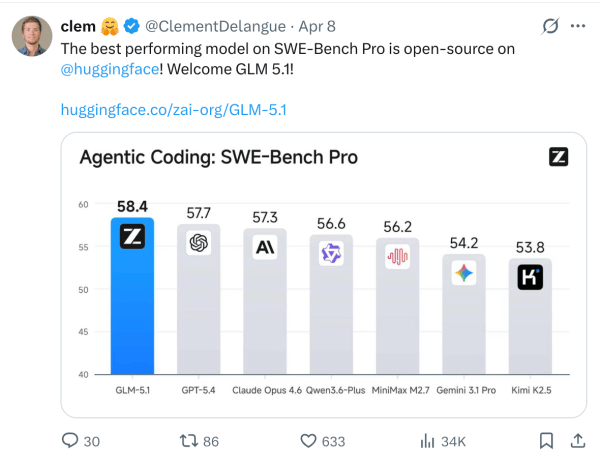 智谱给出的答案完全相反。Mythos被锁起来的次日,GLM-5.1 的权重就出现在 Hugging Face 上,任何人都能下载。
